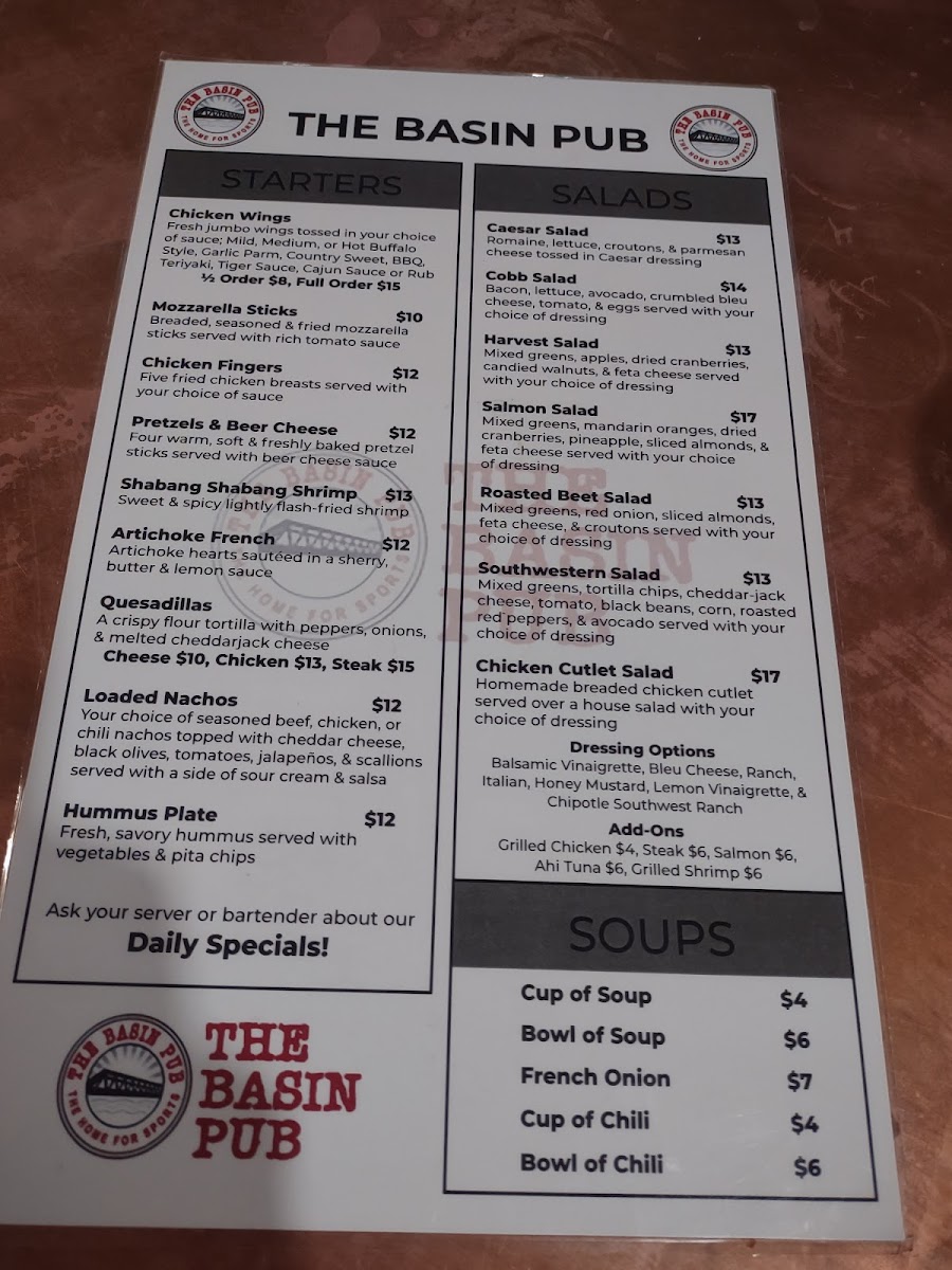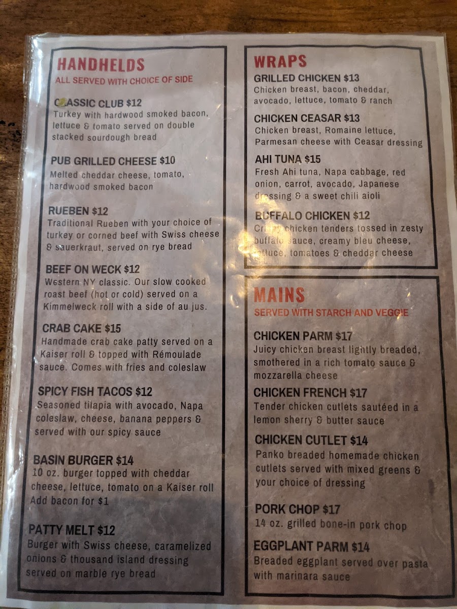 Welcome to The Basin Pub, a hidden gem nestled at 637 Pittsford Victor Rd, Pittsford, NY. This inviting neighborhood pub offers a menu bursting with flavor and variety, perfect for any occasion. Indulge in hearty mains like the Eggplant Parmesan and Grilled Salmon, or dive into their flavorful wraps, including the popular Buffalo Chicken Wrap.